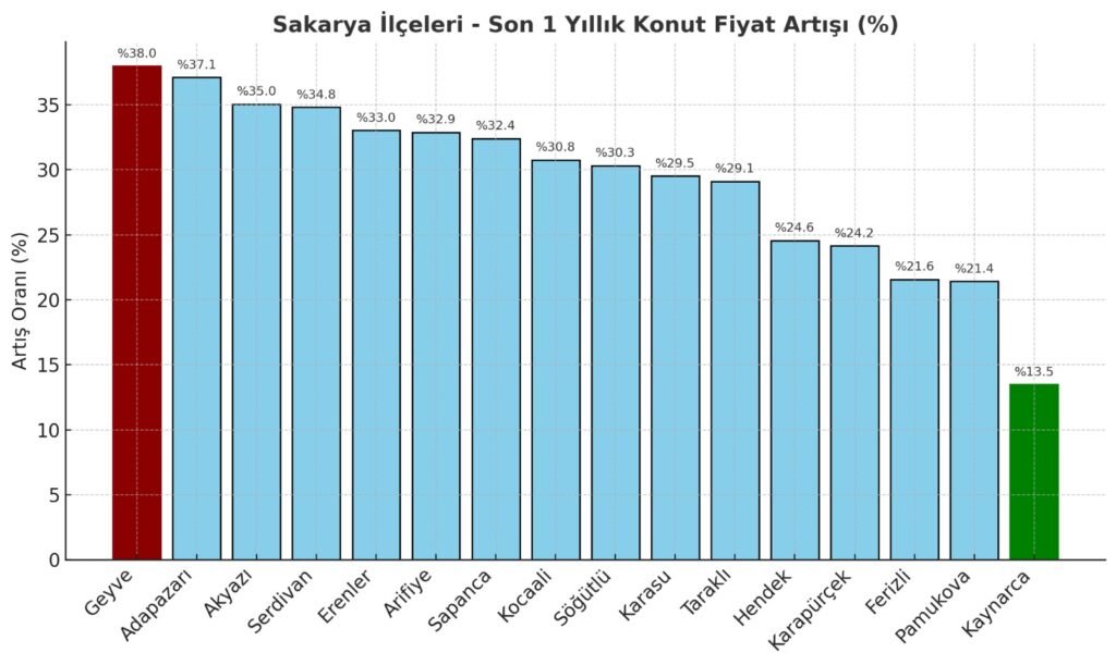 Yıllık artış oranında ise Geyve %37,98 ile ilk sırada. Adapazarı %37,11, Akyazı %35,05 ve Serdivan %34,81 ile fiyat artışında öne çıkan ilçeler oldu. Buna karşılık, Kaynarca %13,49 ile en düşük artış oranına sahip ilçe olarak dikkat çekti.