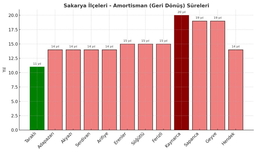 Merkez ilçelerden Adapazarı, Akyazı, Serdivan ve Arifiye’de amortisman süresi 14 yıl civarında. Ancak Sapanca ve Geyve’de geri dönüş süresi 19 yıl, Kaynarca’da ise 20 yıl ile oldukça uzun.